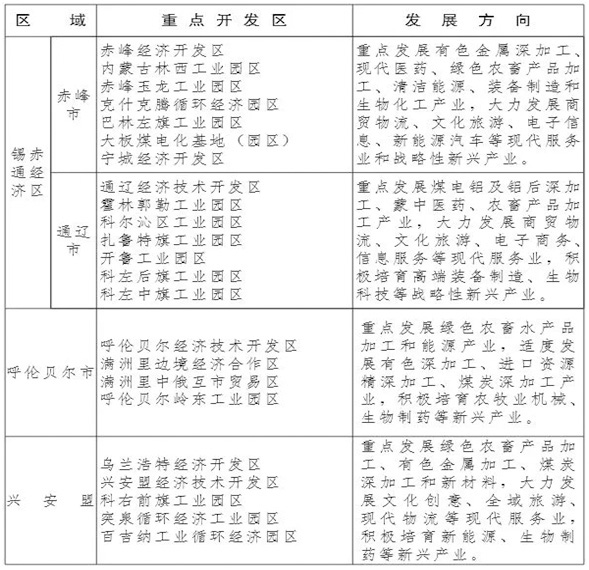 東部地區(qū)開發(fā)區(qū)。積極引導(dǎo)錫林郭勒、赤峰、通遼市開發(fā)區(qū)間合作,主動融入環(huán)渤海、東北經(jīng)濟圈,實現(xiàn)資源互補、產(chǎn)業(yè)聯(lián)動和協(xié)同合作,加快以赤峰經(jīng)濟開發(fā)區(qū)為核心打造產(chǎn)業(yè)轉(zhuǎn)型升級和合作示范區(qū)。以科爾沁、海拉爾、烏蘭浩特等地重點開發(fā)區(qū)為核心,加快培育一批國家級開發(fā)區(qū)和百億元特色園區(qū),構(gòu)建沿交通干線、沿主要河流點狀開發(fā)的產(chǎn)業(yè)格局。發(fā)揮口岸、水資源、煤電等資源互補優(yōu)勢,積極推進東烏珠穆沁旗、西烏珠穆沁旗、霍林郭勒三地開發(fā)區(qū)協(xié)同合作發(fā)展,成為“霍烏哈”金三角區(qū)域新的經(jīng)濟增長極。