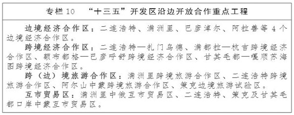 邊(跨)境經(jīng)濟合作區(qū)。貫徹落實國家和自治區(qū)加快沿邊開放開發(fā)的戰(zhàn)略部署,以交通干線為紐帶,以后方城市和產(chǎn)業(yè)為依托,打造邊境經(jīng)濟合作區(qū)和跨境經(jīng)濟合作區(qū),形成以外向型經(jīng)濟為核心的沿邊開發(fā)區(qū)發(fā)展帶。以滿洲里、二連浩特兩個重點開發(fā)開放試驗區(qū)為核心,加快推進二連浩特—扎門烏德、滿洲里—后貝加爾等邊境(跨境)經(jīng)濟合作區(qū)建設(shè),運營發(fā)展好滿洲里綜合保稅區(qū),加快研究設(shè)立跨境旅游合作區(qū),努力構(gòu)建充滿活力的沿邊開發(fā)開放經(jīng)濟帶。